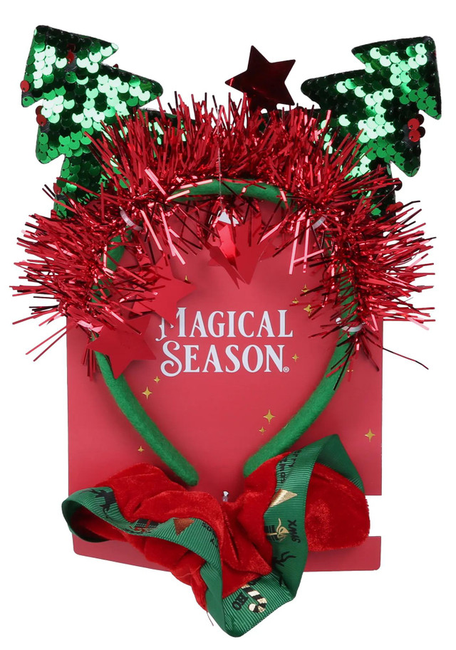 Features a sequin headband with Christmas trees and tinsel with a velour scrunchie