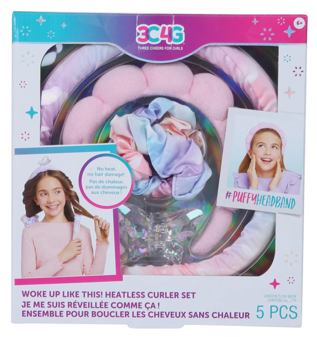 Features heatless curler, 2 hair scrunchies, 1 puffy headband and 1 claw clip