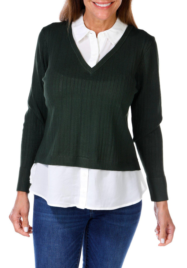 Women's Faux Button Down Cable Knit Sweater 2Fer Top